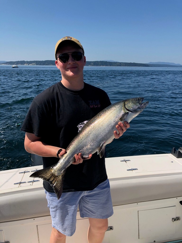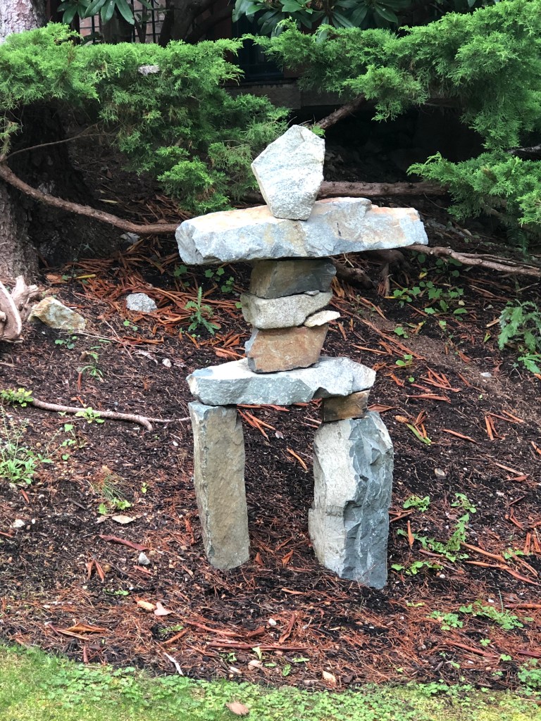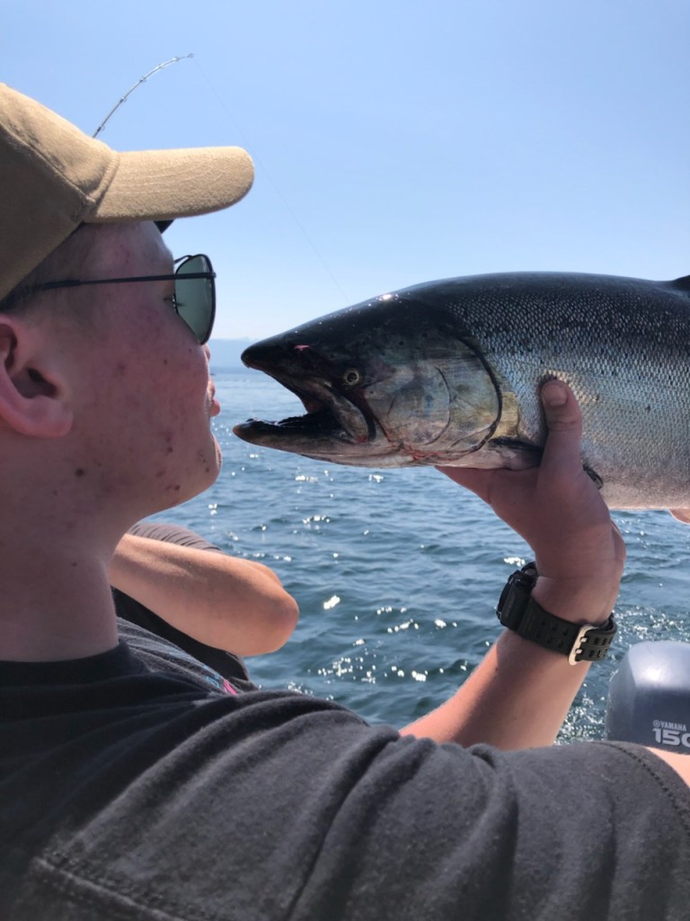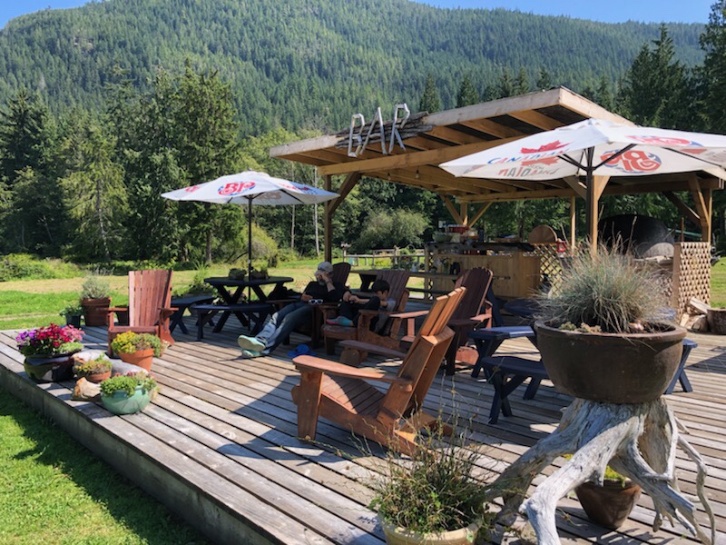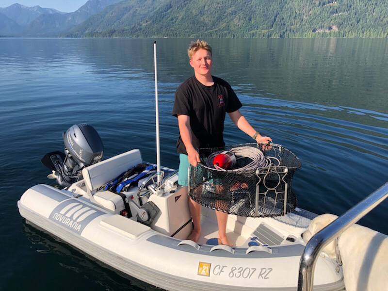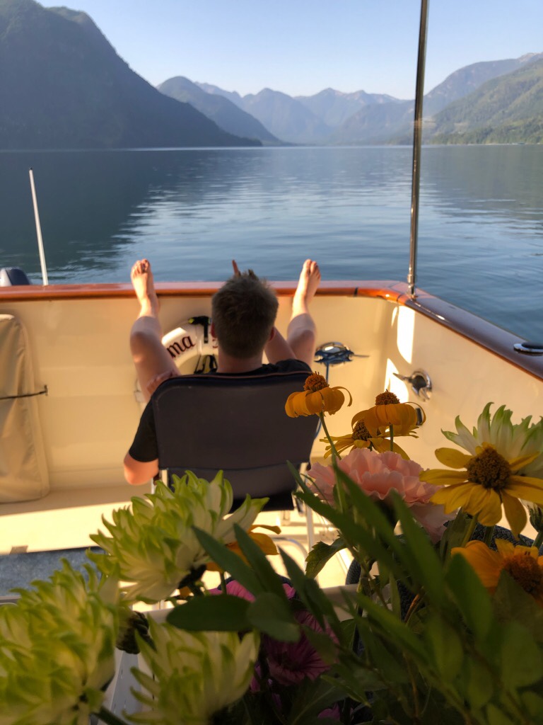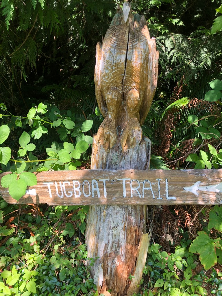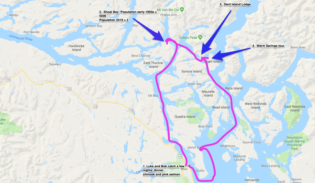 Luke and Bob filled the freezer with salmon from their Campbell River fishing expedition – beautiful pink steaks for us, mangled fish heads for crab trap bait and leftover parts to boil for Duke’s dinner. With the sea’s bounty to feed us, we headed up Discovery Passage to harbors and islands only accessible by passing through rapids. When crossed at slack current, the rapids are benign, but stories of those that ignore slack and lose control of steering in the airy, turbulent waters keep wary mariners on high alert. The rapids are short in distance but safe passage through them becomes a focal point of the day, with everything backward planned to arrive at rapids just ahead of slack, which is a short window. Morning coffee, getting Duke to shore, hoisting the dingy and pulling up anchor all are decided with an eye to slack. The payoff is great!