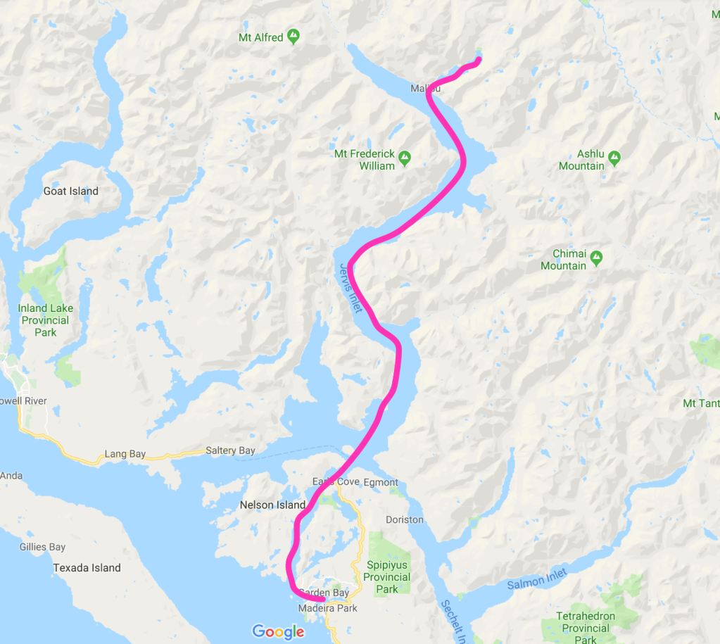 Maximizing our allotted 72 hour stay, we timed the daybreak slack current back through Malibu Rapids, then headed south, stopping in Harmony Sound to see Friel Falls before reaching our destination.
