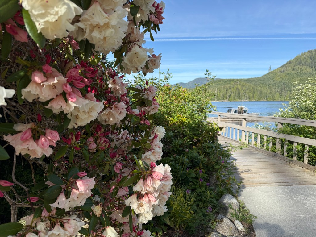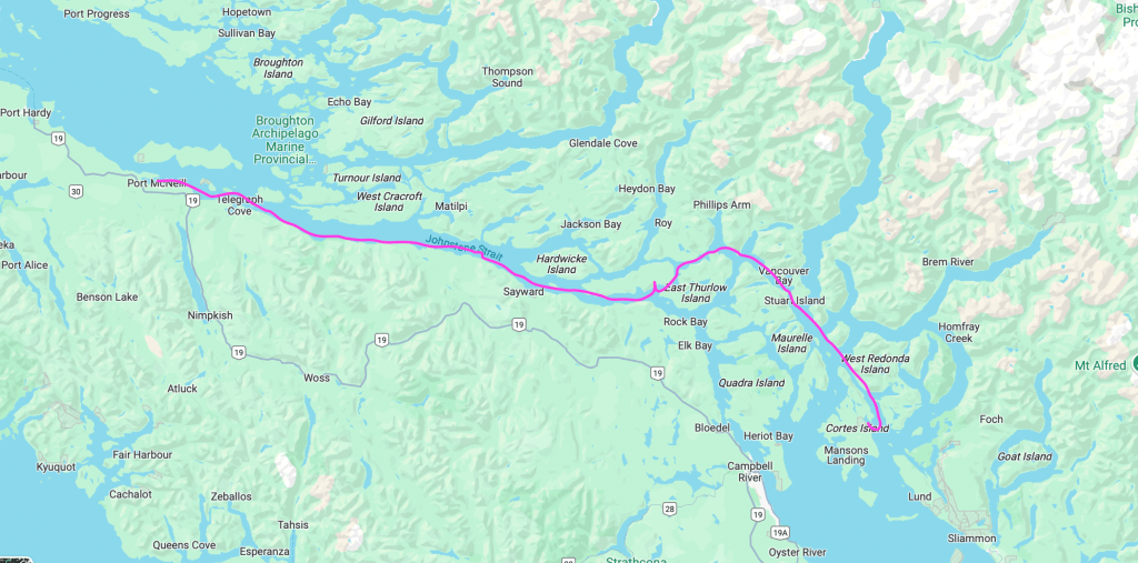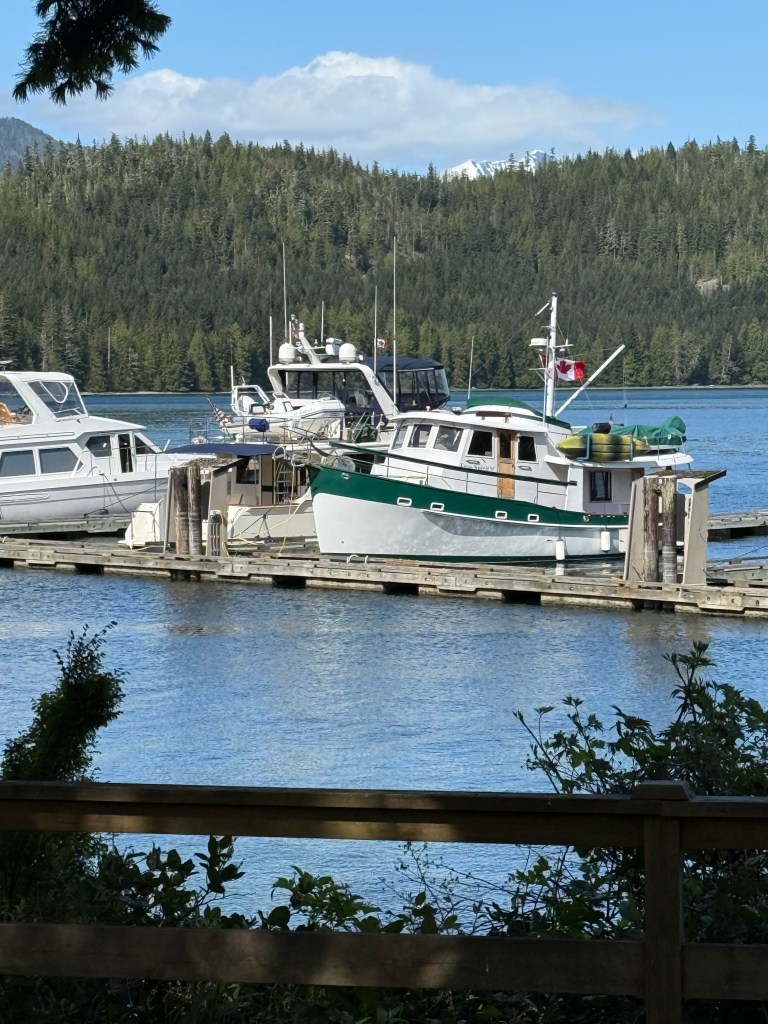 Early in the season, there’s still snow on higher mountain peaks and few vessels on the water. Johnstone Strait, early Thursday morning. Expecting rain today.