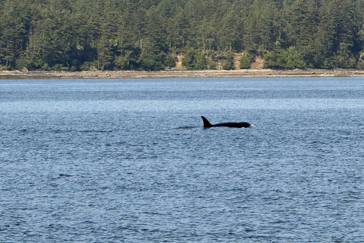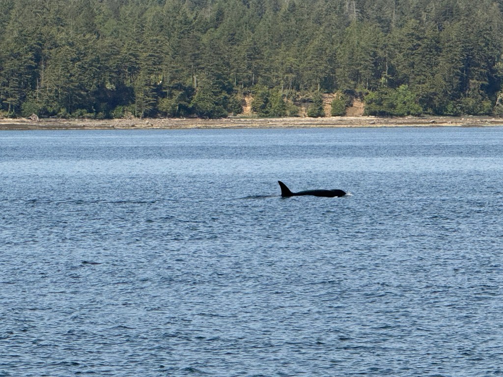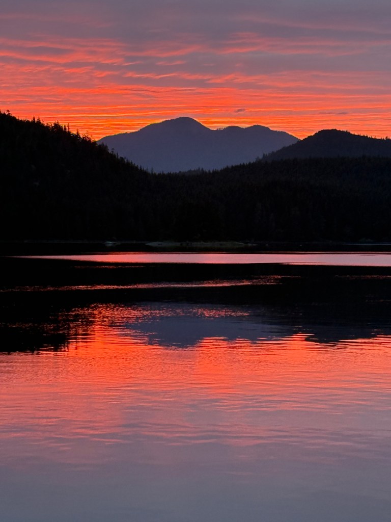 Leaving Nanaimo we had our first orca sighting, and the two traveled next to us for a few miles. After crossing Georgia Strait and heading to Desolation Sound, we opted to anchor in Cortes Bay instead of Refuge Cove due to conditions. Wednesday we passed through the triple rapids between Stuart Island and Dent, timed at slack water, in order to avoid strong northwesterly winds blowing in Johnstone Strait. This morning Johnstone is calm with a favorable current, so we rose at 5 to get an early start and were treated with a glorious sunrise.
