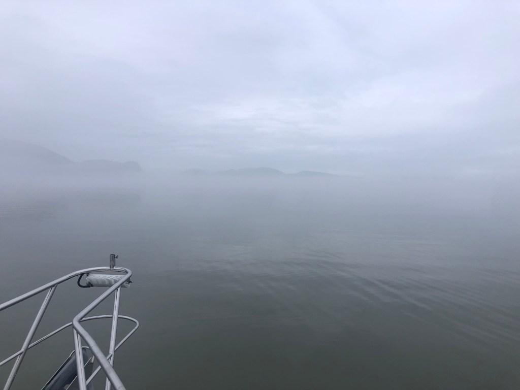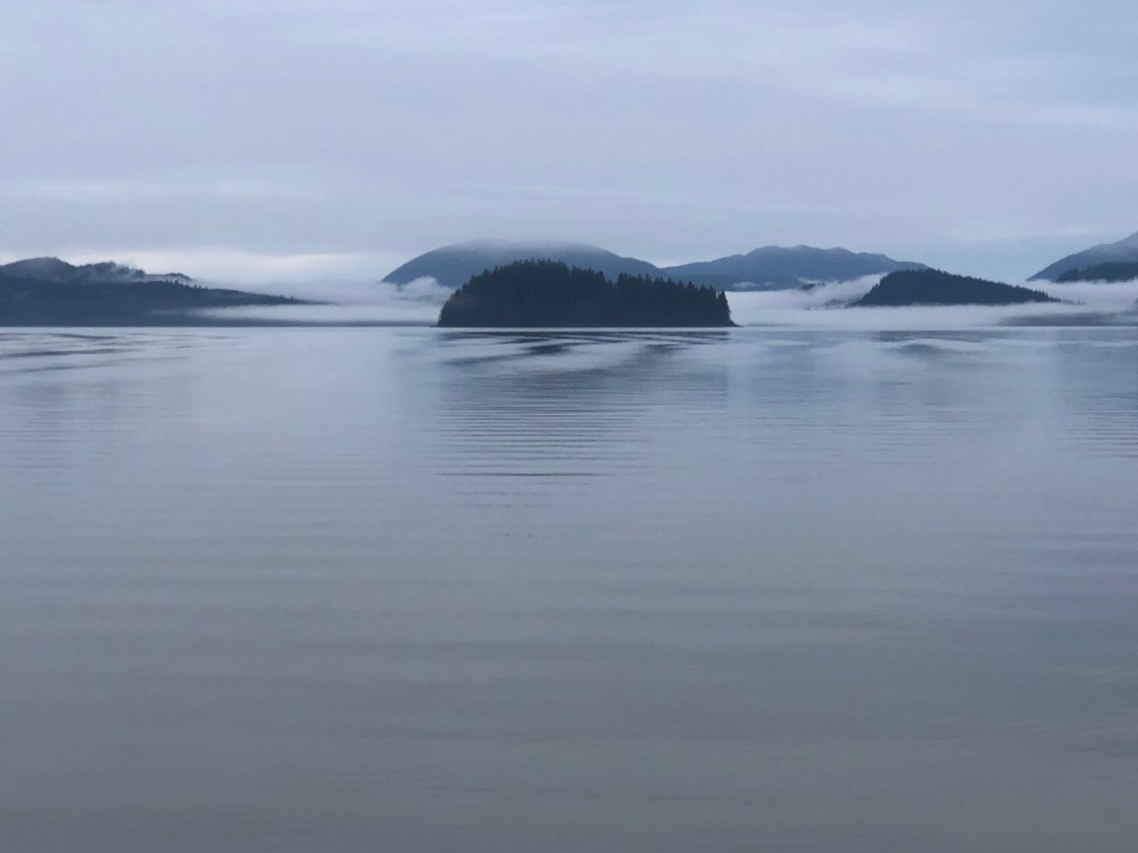 We were up at 4:30 in order to catch a favorable current through Wrangell Narrows, another shallow passage easily navigable and unthreatening if you’ve done your homework. Sunrise was at 3:50 and we never considered visibility would be an issue, but the morning was foggy, so I stood on the bow watching and listening until there was a break in the fog. This is one of my favorite jobs. Bundled up with jackets, foul weather pants and a beanie, my eyes sweep the water for logs, debris or crab pots, and I listen for other boats, occasionally telling Bob to honk our horn if I think another vessel may be near us. Although we move unhurriedly in these conditions, it feels a bit like riding a quiet wave. Cruising slowly over the still water with the engines behind us, I can hear the fluttering of bird wings and the surfacing of sea life, like otters or seals. Alone on the bow with all my senses alert, I get to experience something few others do.