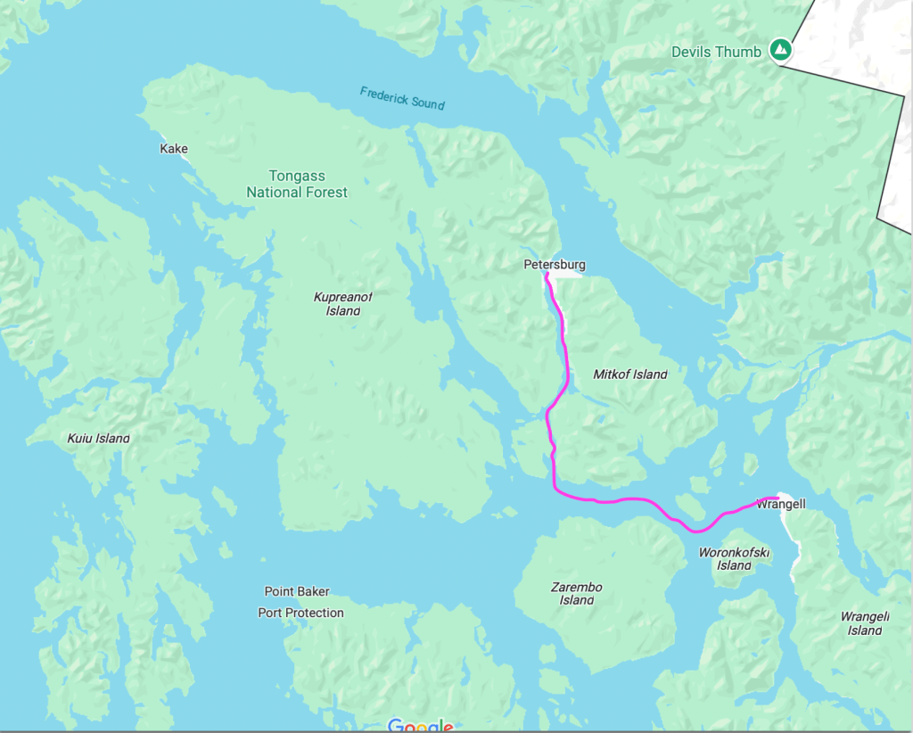 Boaters take the Narrows because what looks like a path on eastern side of Mitkof Island is a drying flat.