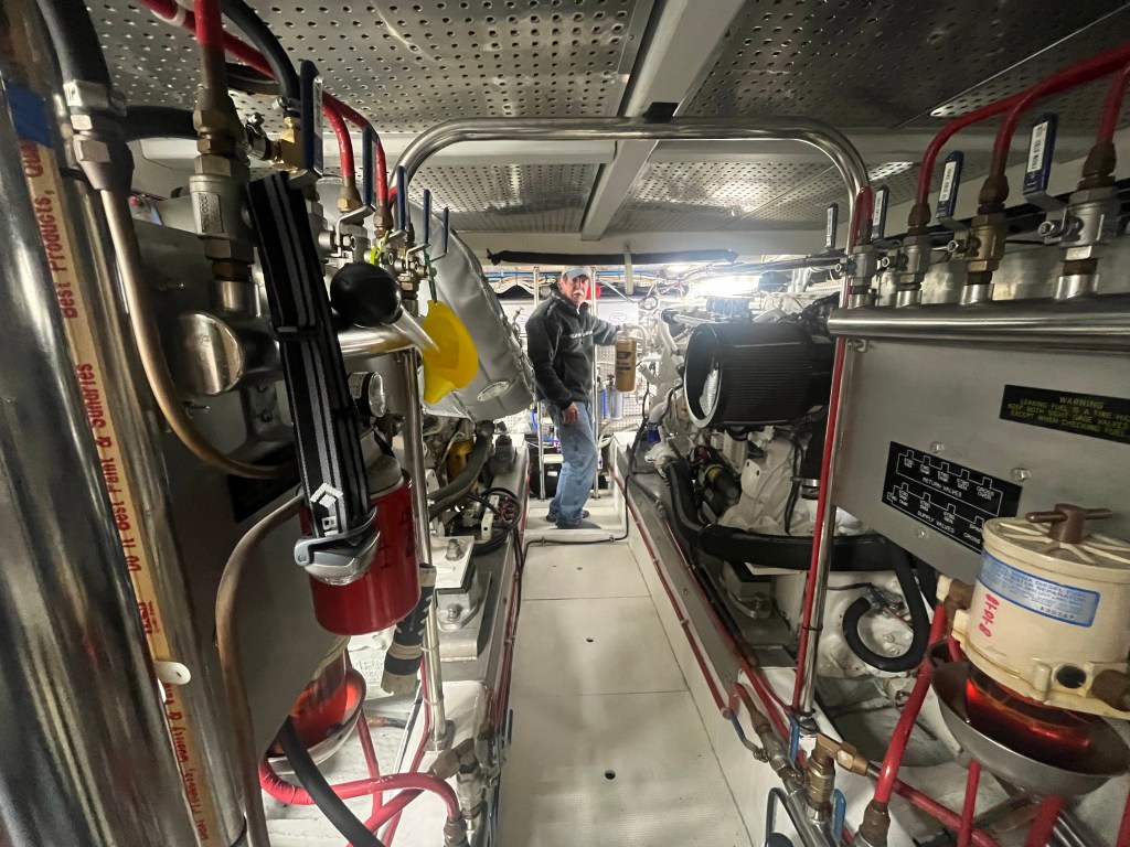 Before every passage, Bob disappears into the engine room. The engine room is a loud, intimidating cavern in the belly of the boat housing two huge Caterpillar diesel engines and two generators; it’s a critical spot to monitor. He checks for water in the bilge, assesses radiator fluid level, looks for leaks, sniffs for new odors, and examines all gauges and the stabilizers. Fuel is closely tracked. We subscribe to the “1/3” fuel rule: use 1/3 on the way out, 1/3 on the way back and save 1/3 for emergencies. An engine room check is never missed.
