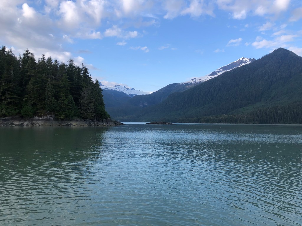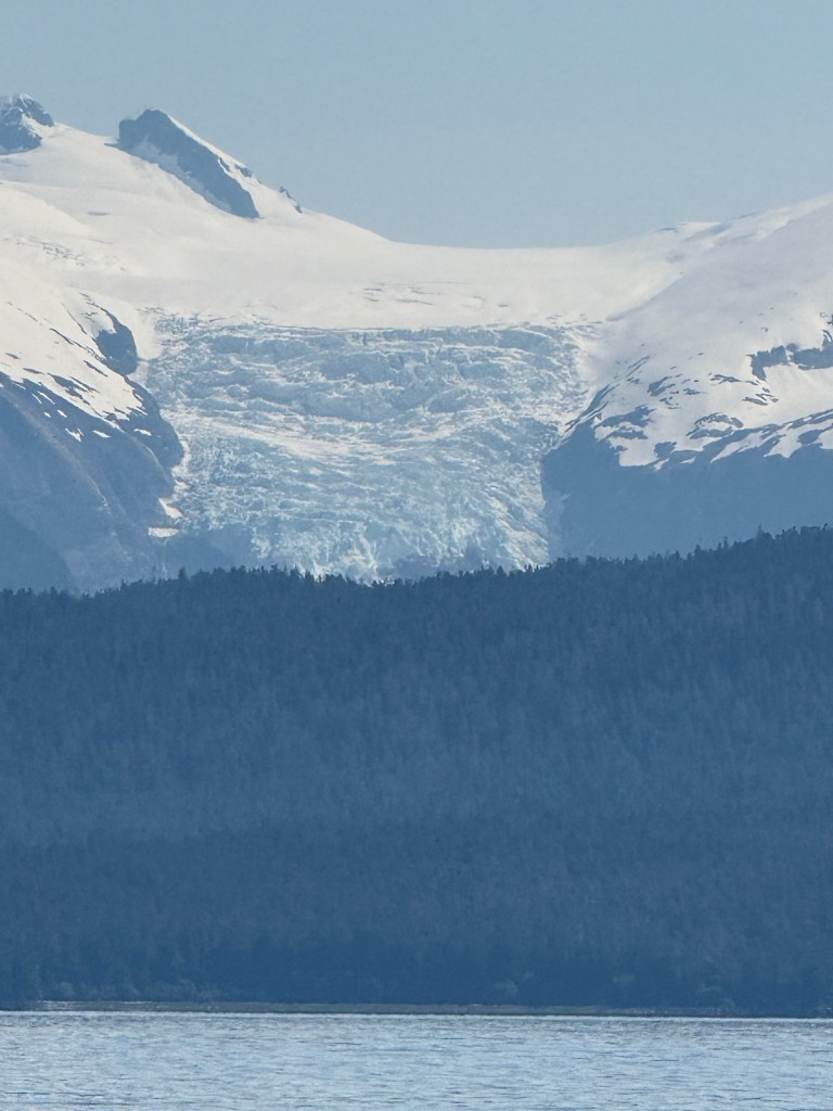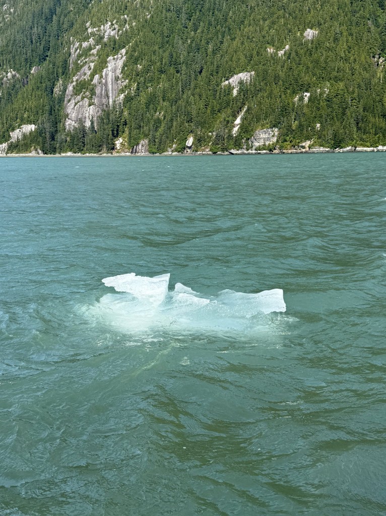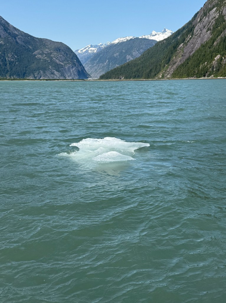 Sunday morning was warm, bright and sunny, and it was a short cruise to Thomas Bay. The cloudless day allowed for a spectacular view of Le Conte Glacier, and we found new hazards on the water to add to our watch list: ice floes! We passed more than a few. A humpback surfaced off our starboard side and we watched her slowly pass us as we made way into Thomas Bay.