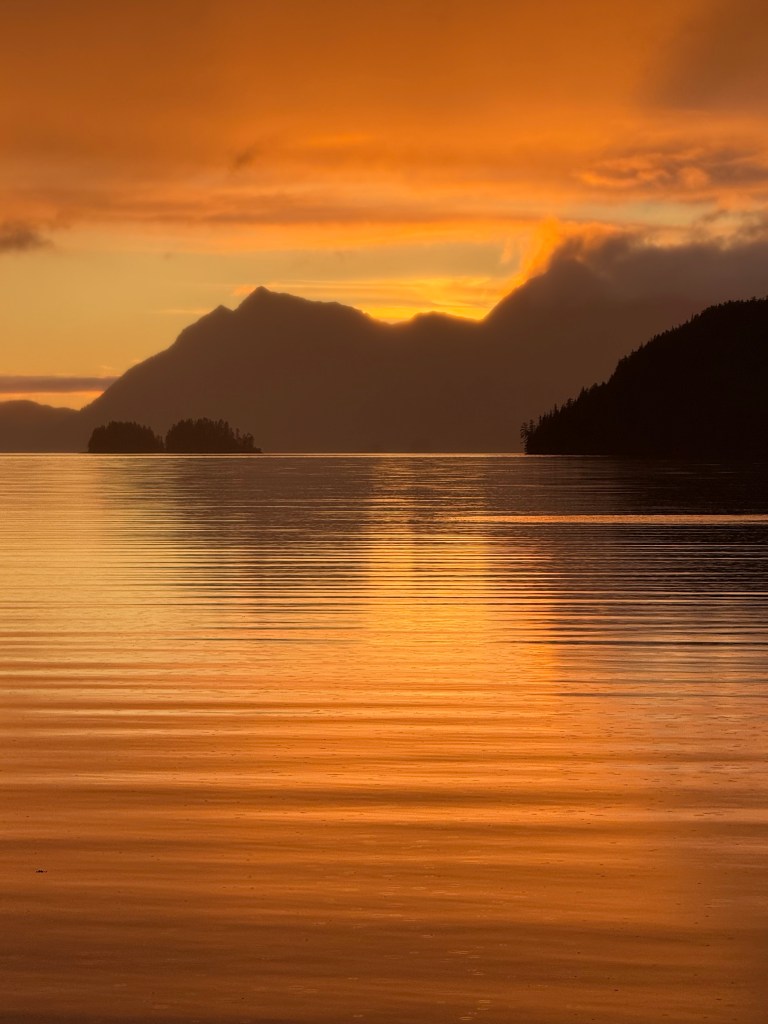 Navigating to Sitka from Peril Strait requires the proper timing of Sergius Narrows, so we departed False Island in time to make slack water in the narrows, making it an uneventful cruise in calm water. We planned to anchor in St. John the Baptist Bay, but those waters were thick with lion’s mane jellyfish. Fascinating to watch, jellyfish can clog generator intakes, rendering them useless, so we opted for a smaller bay close by and set our hook. That evening, the rain stopped just long enough to grill steaks on the back deck, resuming when we were sitting down to eat. We were grateful for the weather break!