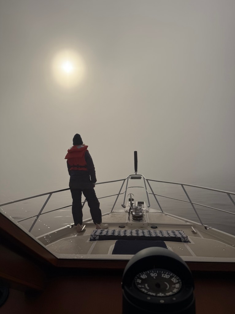The next two days were long cruises, marked by a lot of fog. We covered 86 nautical miles to Big Fry Pan Bay on Wednesday, then crossed a very calm but foggy Cape Caution, making it safely to Port McNeill on Thursday, 70 nautical miles later. NorthIsland Marina squeezed us in during their busy high season so we dropped off homemade cookies to the young staff as a thank you.