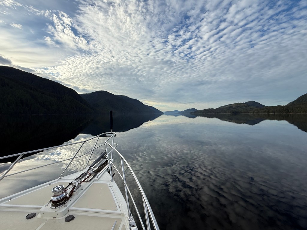 The days were running together, each one long and tiring, but being back in familiar waters made things easier. Our cruise down Johnstone Strait became a highlight, thanks to a pod of dolphins playing in our wake for over an hour. Bob and I took turns on the bow, our head over the side, waving and marveling at their grace, power and persistence. Sometimes they turned on their side, with one eye facing us, and we wondered who was observing whom? Were the they playing? Wanting to communicate? It felt like a gift from the universe – a suspended moment in time, in synch with dolphins.