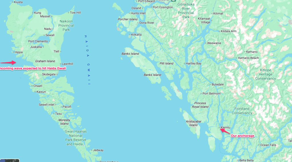 The alert came in again a few minutes later. Then, again. It was repeated numerous times over the next hour, but no other information was forthcoming. This became a big challenge. Kama Hele is equipped with Starlink but Canadian websites and sources had little that could help us make an informed decision. Should we stay? Head out to sea? Take the dinghy to shore and head for high ground? Bob did not want to leave the boat, so getting reliable information was critical. He texted Brian our location coordinates and asked if he could find information. I called Brad, who understands the physics of just about everything and could give us an understanding of likely scenarios. Brad knows what happens to the earth when quakes happen, what kind of quake occurred, and how water would likely move. He knew what happened in San Francisco Bay in the aftermath of Fukushima’s 9.0 earthquake, and had confidence at most we would experience a full tidal change in a quick 20 or 30 minute period, but not a wave. Being at anchor instead of a dock was an advantage; had we stayed at Klemtu docks it would have been prudent to move, difficult due to our fatigue and the diminishing light. When Bob radioed Canadian Coast Guard, they said an incoming wave at Haida Gwaii was expected at 10:10 PM; Brian’s research said a wave would be small, of short duration, and not likely to impact us.
