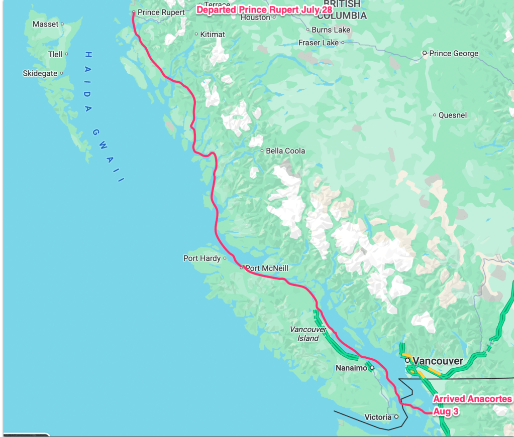 When we arrived in Prince Rupert we were planning a leisurely voyage home, stopping at sights we’d missed on the journey north, and told Canadian Customs we’d be in country about 18 days. When we left Rupert two days later we were hurrying to Anacortes so we could spend a day with Ellie before she moved east.